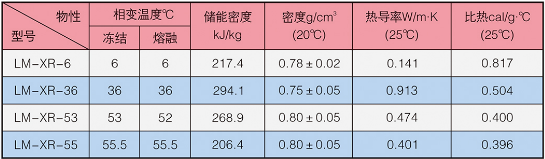 LM-XR系列產(chǎn)品由主儲(chǔ)能劑、相變調(diào)整劑、防過(guò)冷劑、防相分離劑、誘發(fā)劑等多組分復(fù)合制備而成。本品通過(guò)固-液-固相態(tài)變化實(shí)現(xiàn)熱能的儲(chǔ)存和釋放,具有較高的儲(chǔ)能密度及合適的比熱和導(dǎo)熱系數(shù)。本品不易揮發(fā)、安全可靠,可以反復(fù)使用。